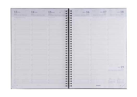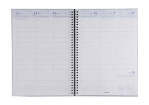 Brepols agenda Omega Kazar 6-talig met 1 week op 2 pagina's en kwartierindeling (08:00-21:00). Boekgebonden met wire-o en met wit papier en scheurhoekjes in een stevige ecologische omslag op formaat 21 x 29 cm.