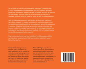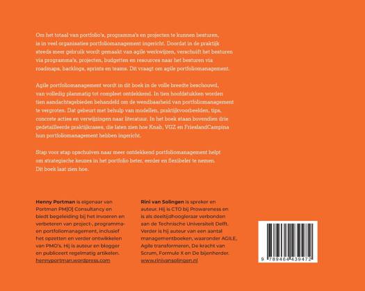 Agile portfoliomanagement wordt in dit boek in de volle breedte beschouwd, van volledig planmatig tot compleet ontdekkend. In tien hoofdstukken worden tien aandachtsgebieden behandeld om de wendbaarheid van portfoliomanagement te vergroten. Dat gebeurt met behulp van modellen, praktijkvoorbeelden, tips, concrete acties en verwijzingen naar literatuur. In het boek staan bovendien drie gedetailleerde praktijkcases, die laten zien hoe Knab, VGZ en FrieslandCampina hun portfoliomanagement hebben ingericht.