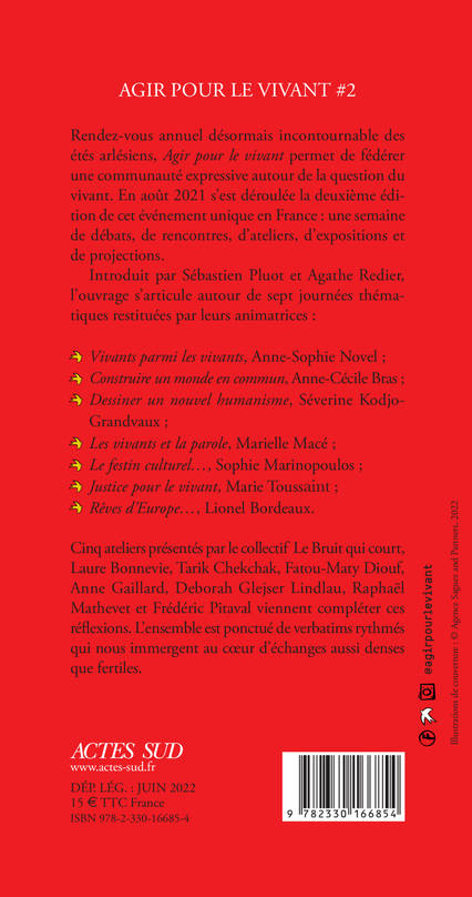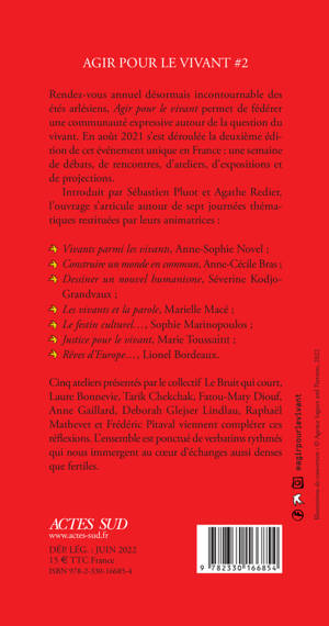 Rendez-vous annuel désormais incontournable des étés arlésiens, Agir pour le vivant permet de fédérer une communauté expressive autour de la question du vivant. En août 2021 s'est déroulée la deuxième édition de cet événement unique en France : une semaine de débats, de rencontres, d'ateliers, d'expositions et de projections. Introduit par Sébastien Pluot et Agathe Redier, l'ouvrage s'articule autour de sept journées thématiques restituées par leurs animatrices : Vivants parmi les vivants, Anne-Sophie Novel ; Construire un monde en commun, Anne-Cécile Bras ; Dessiner un nouvel humanisme, Séverine Kodjo-Grandvaux ; Les vivants et la parole, Marielle Macé ; Le festin culturel..., Sophie Marinopoulos ; Justice pour le vivant, Marie Toussaint ; Rêves d'Europe..., Lionel Bordeaux. Cinq ateliers présentés par le collectif Le Bruit qui court, Laure Bonnevie, Tarik Chekchak, Fatou-Maty Diouf, Anne Gaillard, Deborah Glejser Lindlau, Raphaël Mathevet et Frédéric Pitaval viennent compléter ces réflexions. L'ensemble est ponctué de verbatims rythmés qui nous immergent au coeur d'échanges aussi denses que fertiles.