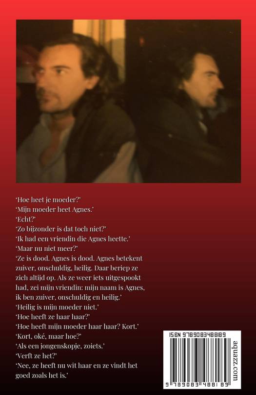‘Hoe heet je moeder?’ ‘Mijn moeder heet Agnes.’ ‘Echt?’ ‘Zo bijzonder is dat toch niet?’ ‘Ik had een vriendin die Agnes heette.’ ‘Maar nu niet meer?’ ‘Ze is dood. Agnes is dood. Agnes betekent zuiver, onschuldig, heilig. Daar beriep ze zich altijd op. Als ze weer iets uitgespookt had, zei mijn vriendin: mijn naam is Agnes, ik ben zuiver, onschuldig en heilig.’ ‘Heilig is mijn moeder niet.’ ‘Hoe heeft ze haar haar?’ ‘Hoe heeft mijn moeder haar haar? Kort.’ ‘Kort, oké, maar hoe?’ ‘Als een jongenskopje, zoiets.’ ‘Verft ze het?’ ‘Nee, ze heeft nu wit haar en ze vindt het goed zoals het is.’