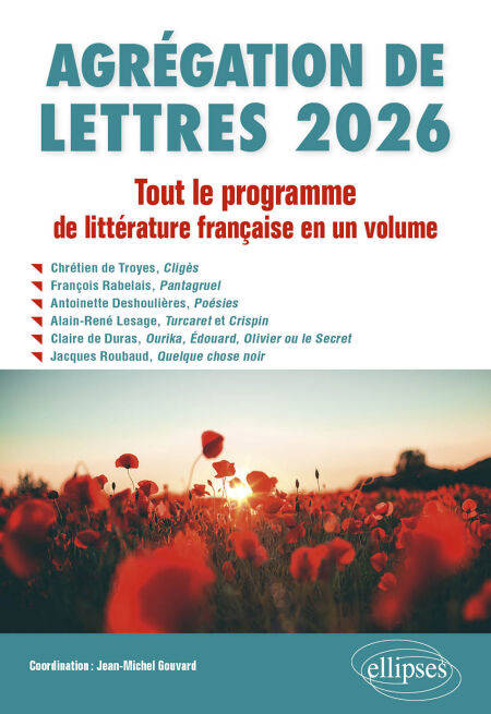 Ce manuel propose un cours complet sur chacune des œuvres de littérature française inscrites au programme de l’agrégation de Lettres modernes 2026 : Cligès de Chrétien de Troyes ; Pantagruel de François Rabelais ; Poésies d'Antoinette Deshoulières, ; Turcaret et Crispin d'Alain-René Lesage ; Ourika, Édouard, Olivier ou le Secret de Claire de Duras ; Quelque chose noir de Jacques Roubaud.