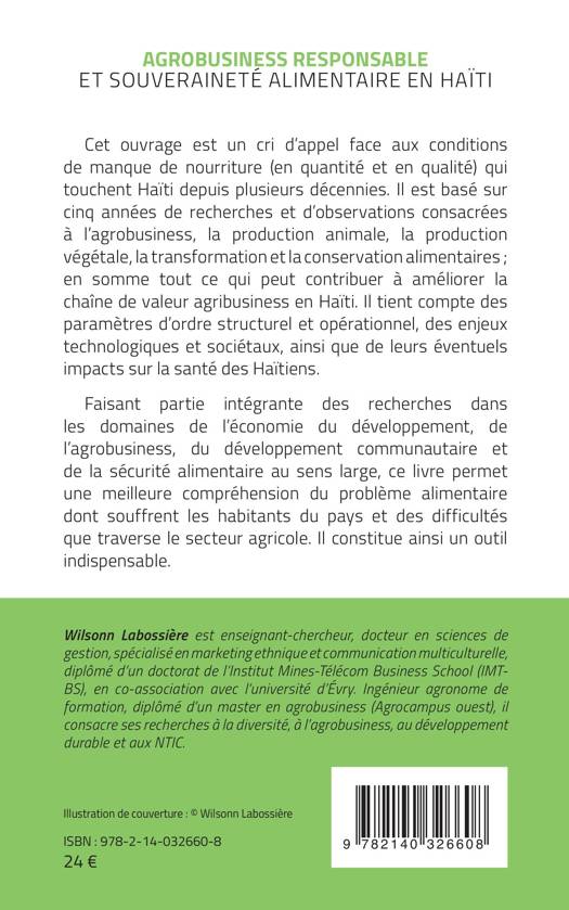 Cet ouvrage est un cri d'appel face aux conditions de manque de nourriture (en quantité et en qualité) qui touchent Haïti depuis plusieurs décennies. Il est basé sur cinq années de recherches et d'observations consacrées à l'agrobusiness, la production animale, la production végétale, la transformation et la conservation alimentaires; en somme tout ce qui peut contribuer à améliorer la chaîne de valeur agribusiness en Haïti. Il tient compte des paramètres d'ordre structurel et opérationnel, des enjeux technologiques et sociétaux, ainsi que de leurs éventuels impacts sur la santé des Haïtiens. Ce livre permet une meilleure compréhension du problème alimentaire dont souffrent les habitants du pays et des difficultés que traverse le secteur agricole.