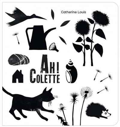 Chaque double page présente les silhouettes noires au coeur d'un jardin : fleur, caillou, oiseau, escargot, entre autres, ainsi que le détail de ces derniers avec la coquille de l'escargot ou le coeur de la fleur par exemple. Colette les arrose avec son arrosoir vert mais rien ne bouge. Tout s'anime lorsque la pluie tombe.