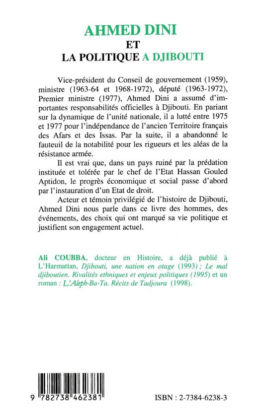 Vice-président du Conseil de gouvernement, ministre, député, Premier ministre, Ahmed Dini a assumé d'importantes responsabilités officielles à Djibouti. Acteur et témoin privilégié de l'histoire de Djibouti, Ahmed Dini nous parle dans ce livre des hommes, des événements, des choix qui ont marqué sa vie politique et justifient son engagement actuel.
