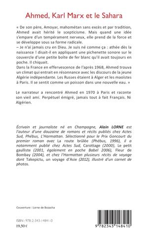 « De son père, Amoyar, mahométan sans excès et par tradition, Ahmed avait hérité le scepticisme. Mais quand une idée s'empare d'un tempérament nerveux, elle prend de la force et se développe sous sa forme radicale. Je n'ai jamais cru en Dieu. Je suis né comme ça : athée dès la naissance ! disait-il en appliquant une pichenette sonore sur le couvercle d'une petite boîte de fer blanc qu'il avait toujours en poche. Il chiquait. » Le narrateur a rencontré Ahmed en 1970 à Paris et raconte son vieil ami. Perpétuel émigré, jamais tout à fait Français. Ni Algérien.