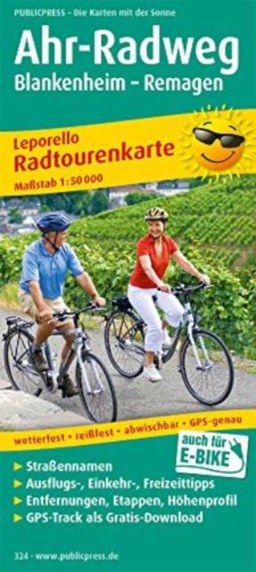 De kaart presenteert het 77 km lange Ahr-fietspad dat de loop van de Ahr-rivier volgt, van de bron tot de samenvloeiing met de Rijn bij Remagen. De vlakke route maakt het interessant voor gezinnen. Als u het wijnbouwgebied Ahr oversteekt, kunt u steden als Bad Neuenahr-Ahrweiler, Sinzig of Remagen bewonderen. Waar stoppen de moeite waard is, vindt u in de informatiegedeelten van de fietskaart.