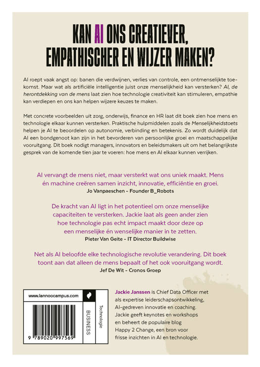 'AI vervangt de mens niet, maar versterkt wat ons uniek maakt. Mens én machine creëren samen inzicht, innovatie, efficiëntie en groei.' Jo Vanpaeschen - Founder B_Robots 'De kracht van AI ligt in het potentieel om onze menselijke capaciteiten te versterken. Jackie laat als geen ander zien hoe technologie pas echt impact maakt door deze op een menselijke én wenselijke manier in te zetten.' Pieter Van Geite - IT Director Buildwise 'Net als AI beloofde elke technologische revolutie verandering. Dit boek toont aan dat alleen de mens bepaalt of het ook vooruitgang wordt.' Jef De Wit - Cronos Groep