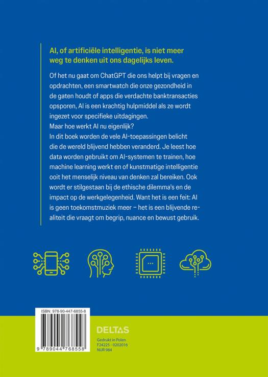 AI, of artificiële intelligentie, is niet meer weg te denken uit ons dagelijks leven. In dit begrijpelijke boek worden de belangrijkste begrippen en theorieën eenvoudig uitgelegd en de AI-toepassingen belicht die de wereld blijvend hebben veranderd. Je leest hoe data worden gebruikt om AI-systemen te trainen, hoe machine learning werkt en of kunstmatige intelligentie ooit het menselijk niveau van denken zal bereiken. Ook wordt er stilgestaan bij de ethische dilemma's en de impact op de werkgelegenheid. Want het is een feit: AI is geen toekomstmuziek meer - het is een blijvende realiteit die vraagt om begrip, nuance en bewust gebruik.