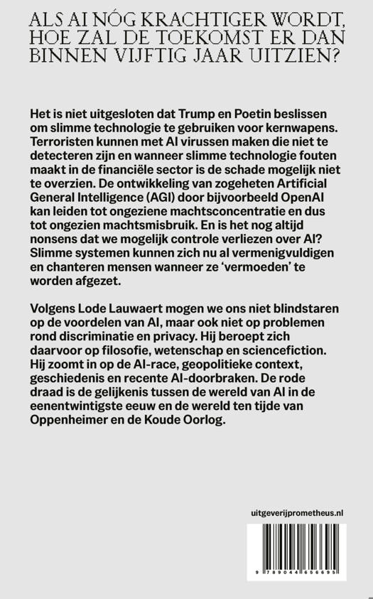 Volgens Lode Lauwaert mogen we ons niet blindstaren op de voordelen van AI, maar ook niet op problemen rond discriminatie en privacy. Hij beroept zich daarvoor op filosofie, wetenschap en sciencefiction. Hij zoomt in op de AI-race, de geschiedenis en recente doorbraken. De rode draad is de gelijkenis tussen de wereld van AI in de eenentwintigste eeuw en de wereld ten tijde van Oppenheimer en de Koude Oorlog.
