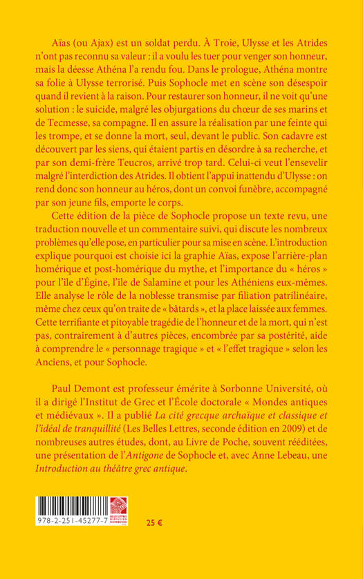 Aias (ou Ajax) est un soldat perdu. A Troie, Ulysse et les Atrides n'ont pas reconnu sa valeur: il a voulu les tuer pour venger son honneur, mais la deesse Athena l'a rendu fou. Dans le prologue, Athena montre sa folie a Ulysse terrorise. Puis Sophocle met en scene son desespoir quand il revient a la raison. Pour restaurer son honneur, il ne voit qu'une solution: le suicide, malgre les objurgations du choeur de ses marins et de Tecmesse, sa compagne. Il en assure la realisation par une feinte qui les trompe, et se donne la mort, seul, devant le public. Son cadavre est decouvert par les siens, qui etaient partis en desordre a sa recherche, et par son demi-frere Teucros, arrive trop tard. Celui-ci veut l'ensevelir malgre l'interdiction des Atrides. Il obtient l'appui inattendu d'Ulysse: on rend donc son honneur au heros, dont un convoi funebre, accompagne par son jeune fils, emporte le corps. Cette edition de la piece de Sophocle propose un texte revu, une traduction nouvelle et un commentaire suivi, qui discute les nombreux problemes qu'elle pose, en particulier pour sa mise en scene. L'introduction explique pourquoi est choisie ici la graphie Aias, expose l'arriere-plan homerique et post-homerique du mythe, et l'importance du heros pour l'ile d'Egine, l'ile de Salamine et pour les Atheniens eux-memes. Elle analyse le role de la noblesse transmise par filiation patrilineaire, meme chez ceux qu'on traite de batards , et la place laissee aux femmes. Cette terrifiante et pitoyable tragedie de l'honneur et de la mort, qui n'est pas, contrairement a d'autres pieces, encombree par sa posterite, aide a comprendre le personnage tragique et l'effet tragique selon les Anciens, et pour Sophocle.