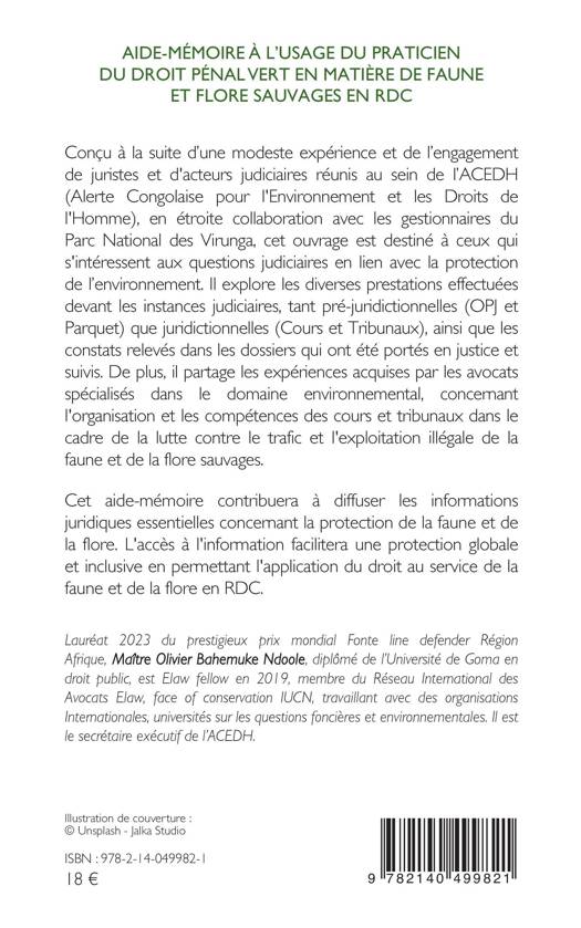 Conçu à la suite d’une modeste expérience et de l’engagement de juristes et d'acteurs judiciaires réunis au sein de l ACEDH (Alerte Congolaise pour l'Environnement et les Droits de l'Homme), en étroite collaboration avec les gestionnaires du Parc National des Virunga, cet ouvrage est destiné à ceux qui s'intéressent aux questions judiciaires en lien avec la protection de l’environnement. Il explore les diverses prestations effectuées devant les instances judiciaires, tant pré-juridictionnelles (OPJ et Parquet) que juridictionnelles (Cours et Tribunaux), ainsi que les constats relevés dans les dossiers qui ont été portés en justice et suivis. De plus, il partage les expériences acquises par les avocats spécialisés dans le domaine environnemental, concernant l'organisation et les compétences des cours et tribunaux dans le cadre de la lutte contre le trafic et l'exploitation illégale de la faune et de la flore sauvages. Cet aide-mémoire contribuera à diffuser les informations juridiques essentielles concernant la protection de la faune et de la flore. L'accès à l'information facilitera une protection globale et inclusive en permettant l'application du droit au service de la faune et de la flore en RDC.