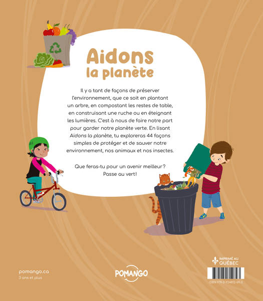 Il y a tant de façons de préserver l’environnement, que ce soit en plantant un arbre, en compostant les restes de table, en construisant une ruche ou en éteignant les lumières. C’est à nous de faire notre part pour garder notre planète verte. En lisant Aidons la planète, tu exploreras 44 façons simples de protéger et de sauver notre environnement, nos animaux et nos insectes. Que feras-tu pour un avenir meilleur ? Passe au vert !
