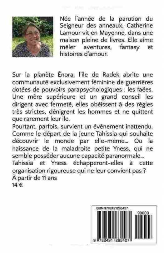 Tahissia, Yness, deux faées, deux destins, deux histoires de fantasy, d’amour et d’affirmation de soi sur la planète Énora Sur la lointaine planète Énora, l’ile de Radek abrite une communauté exclusivement féminine de guerrières dotées de pouvoirs parapsychologiques : les faées. Une mère supérieure et un grand conseil les dirigent avec fermeté, elles obéissent à des règles très strictes, dénigrent les hommes et ne quittent que rarement leur ile. Pourtant, parfois, survient un évènement inattendu. Comme le départ de la jeune Tahissia chargée d’éduquer les deux petites sœurs du roi du Vélène. Elle va enfin réaliser son rêve de découvrir le monde par elle-même. Mais, loin des sévères mères faées, la fidélité de la jeune fille à l’ordre de Radek sera mise à rude épreuve. Quant à Yness, contrairement à toutes les petites faées, elle se révèle dès sa naissance dénuée de tout pouvoir et particulièrement maladroite. Ses amies Nolène et Évata sont les seules à lui témoigner de l’affection. Parviendront-elles à lui venir en aide ? Tahissia et Yness échapperont-elles à cette organisation rigoureuse qui ne leur convient pas ? Peut-être l’amour est-il la solution… Deux textes accessibles dès 11 ans et jusqu'à 111 ans et au-delà. Une version précédente de ces deux formats courts à été publiée sous les titres : « Tahissia, la faée renégate » et « Yness de Radek, la faée sans pouvoirs ».