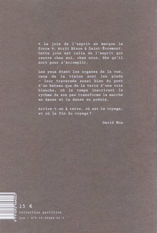Dehors plutôt qu'ailleurs est le premier livre de la collection "Partition". Il s'agit de présenter le texte d'un poète illustré par un artiste. Ainsi David Mus nous emmène à Saint-Pierre-et-Miquelon, où l'auteur est sans cesse partagé entre la mer et la terre qui se font face : sur la page de gauche la mer et sur la page de droite la terre.
