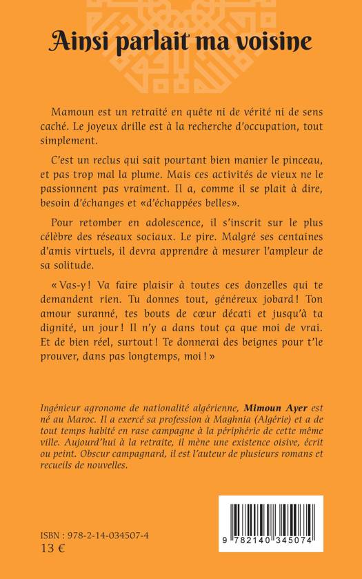 Mamoun est un retraité en quête ni de vérité ni de sens caché. Le joyeux drille est à la recherche d'occupation, tout simplement. C'est un reclus qui sait pourtant bien manier le pinceau, et pas trop mal la plume. Mais ces activités de vieux ne le passionnent pas vraiment. Il a, comme il se plait à dire, besoin d'échanges et d'échappées belles. Pour retomber en adolescence, il s'inscrit sur le plus célèbre des réseaux sociaux. Le pire. Malgré ses centaines d'amis virtuels, il devra apprendre à mesurer l'ampleur de sa solitude. Vas-y! Va faire plaisir à toutes ces donzelles qui te demandent rien. Tu donnes tout, généreux jobard! Ton amour suranné, tes bouts de coeur décati et jusqu'à ta dignité, un jour! Il n'y a dans tout ça que moi de vrai. Et de bien réel, surtout! Te donnerai des beignes pour t'le prouver, dans pas longtemps, moi !