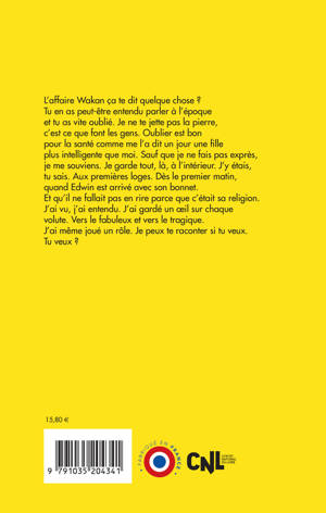 L'affaire Wakan ça te dit quelque chose ? Tu en as peut-être entendu parler à l'époque et tu as vite oublié. Je ne te jette pas la pierre, c'est ce que font les gens. Oublier est bon pour la santé comme me l'a dit un jour une fille plus intelligente que moi. Sauf que je ne fais pas exprès, je me souviens. Je garde tout, là, à l'intérieur. J'y étais, tu sais. Aux premières loges. Dès le premier matin, quand Edwin est arrivé avec son bonnet. Et qu'il ne fallait pas en rire parce que c'était sa religion. J'ai vu, j'ai entendu. J'ai gardé un oeil sur chaque volute. Vers le fabuleux et vers le tragique. J'ai même joué un rôle. Je peux te raconter si tu veux. Tu veux ?