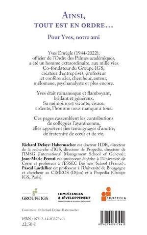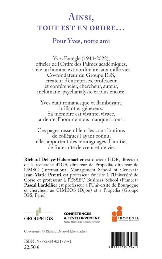 Yves Enrègle (1944-2022), officier de l'Ordre des Palmes académiques, a été un homme extra-ordinaire, aux mille vies. Co-fondateur du Groupe IGS, créateur d'entreprises, professeur et conférencier, chercheur, auteur, mélomane, psychanalyste et plus encore. Yves était romanesque et flamboyant, brillant et généreux. Sa mémoire est vivante, vivace, ardente, l'homme nous manque à tous. Ces pages rassemblent les contributions de collègues l'ayant connu, elles apportent des témoignages d'amitié, de fraternité de coeur et de vie.
