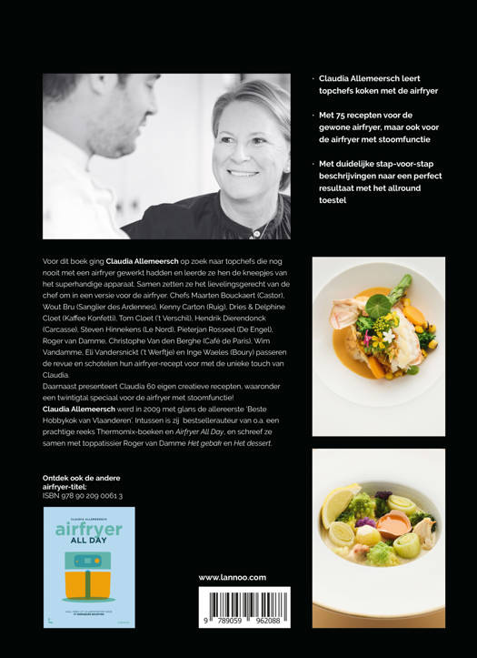 Voor dit boek ging Claudia Allemeersch op zoek naar topchefs die nog nooit met een airfryer gewerkt hadden en leerde ze hen de kneepjes van het superhandige apparaat. Samen zetten ze het lievelingsgerecht van de chef om in een versie voor de airfryer. Chefs Maarten Bouckaert (Castor), Wout Bru (Sanglier des Ardennes), Kenny Carton (Ruig), Dries & Delphine Cloet (Kaffee Konfetti), Tom Cloet ('t Verschil), Hendrik Dierendonck (Carcasse), Steven Hinnekens (Le Nord), Pieterjan Rosseel (De Engel), Roger van Damme, Christophe Van den Berghe (Café de Paris), Wim Vandamme, Eli Vandersnickt ('t Werftje) en Inge Waeles (Boury) passeren de revue en schotelen hun airfryer-recept voor met de unieke touch van Claudia.