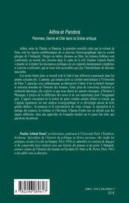 Aithra, mère de Thésée, et Pandora, la première mortelle créée par la volonté de Zeus, sont les figures emblématiques dans la société grecque de l'Antiquité. Les femmes hellènes sont confrontées au monde des citoyens dans le cadre de la cité. L'auteur s'attache ici à étudier les résonances politiques de ces rapports éminemment complexes et souvent conflictuels, qui ne nous sont accessibles que par l'intermédiaire de discours masculins. Une exploration aux travers les discours des auteurs classiques, d'Homère à Plutarque, à propos de la différence des sexes.
