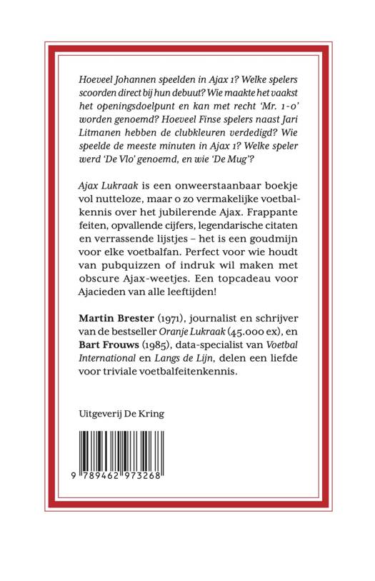 AJAX LUKRAAK is een onweerstaanbaar boekje vol nutteloze, maar o zo vermakelijke voetbalkennis over het jubilerende Ajax. Frappante feiten, opvallende cijfers, legendarische citaten en verrassende lijstjes – het is een goudmijn voor elke voetbalfan. Perfect voor wie houdt van pubquizzen of indruk wil maken met obscure Ajaxweetjes. Een topcadeau voor Ajacieden van alle leeftijden!