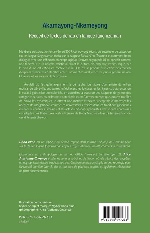 Voici un ensemble de textes de rap en langue fang nzaman écrits par le rappeur Roda N'no. Traduite et commentée en dialogue avec une réflexion anthropologique, l'oeuvre allie la culture hip-hop aux savoirs acquis par le biais d'une éducation en contexte rural. Elle est le produit d'un effort de création d'espaces musicaux à l'interstice entre l'urbain et le rural, entre les jeunes générations de Libreville et les anciens de la province.
