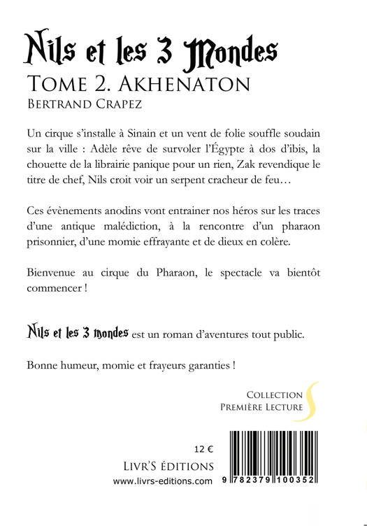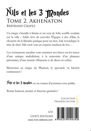 Un cirque s’installe à Sinain et un vent de folie souffle soudain sur la ville : Adèle rêve de survoler l’Égypte à dos d’ibis, la chouette de la librairie panique pour un rien, Zak revendique le titre de chef, Nils croit voir un serpent cracheur de feu… Ces évènements anodins vont entrainer nos héros sur les traces d’une antique malédiction, à la rencontre d’un pharaon prisonnier, d’une momie effrayante et de dieux en colère. Bienvenue au cirque du Pharaon, le spectacle va bientôt commencer ! Nils et les 3 mondes est un roman d’aventures tout public. Bonne humeur, momie et frayeurs garanties !