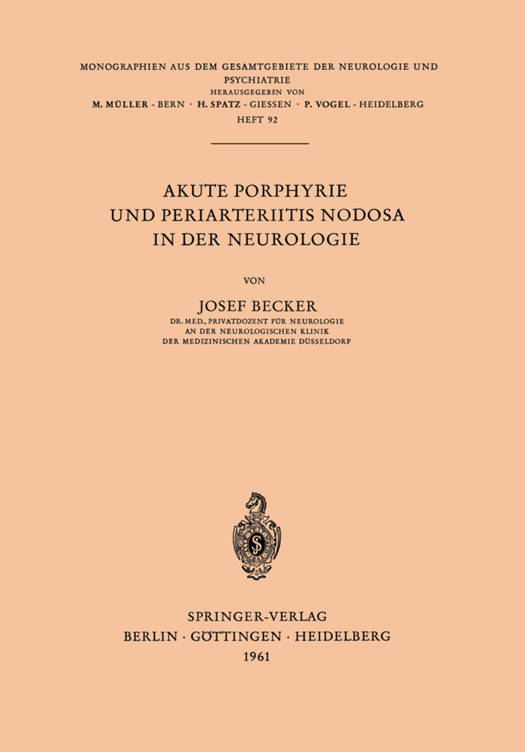 Die schon seit emem Menschenalter zu den "Inborn errors of metabolism" (A. E. GARROD) zahlende und bereits ebensolange in ihrem klinischen Erscheinungs- bild (F. GUNTHER) bekannte Porphyrie hat gerade in jungster Zeit eine besondere Bedeutung erlangt, weil sie als ein Musterbeispie1 der genbedingten Stoffwechs- und Struktur-Anomalien angesehen werden kann. Wenn die Akute Porphyrie bislang aber in der Differentialdiagnose intern- neurologischer und auch psychischer Krankheitsbilder keine wesentliche Rolle gespie1t hat, so ist der Grund hierfur sicher nicht ihre Seltenheit, sondern vie1mehr der, daB es auBer der auf die "Konstitutionsanomalie" Porphyrismus hinweisenden - jedoch nicht obligaten - typischen Urinverfarbung, kein einziges klinisches Symptom gibt, das fur die "Krankheit" Akute Porphyrie pathognomonisch ware. Indem sich die Akute Porphyrie auf Grund des ihr eigenen intcrmittierenden Verlaufes, sowohl generell als auch individuell, in sehr unterschiedlicher Auspragung hinter der "Maske" einer internen, psychischen und gar nicht so selten neurologi- schen Symptomatik verbergen kann, weist sie jedoch mit der of\: gleichfalls als vollig "ratse1haJaes Krankheitsgeschehen" imponierenden Periarteriitis nodosa in ihrem klinischen Erscheinungsbild eine so frappierende Ahnlichkeit auf, daB die Poly- symptomatologie als das Charakteristikum und differentialdiagnostische Kriterium beider Krankheiten gelten kann. Inhaltsverzeichnis A. Akute Porphyrie . 1 I. Zur Physiologie und Pathophysiologie der Porphyrine 1 II. Zur Einteilung der Porphyrie . 3 III. Das klinische Erscheinungsbild der akuten Porphyrie 5 a) Eigene Kasuistik 5 1. Familiare Porphyrie und Verlaufsformen der akuten Porphyrie 5 2. Rezidivierende Polyneuritis (unter Beriicksichtigung der bisher 22 unklar gebliebenen Faile) 3. Rezidivierende Polyneuritis mit rezidivierender Alopecie . 24 4. Chronische Polyneuritis .
