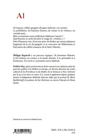 Al Capone, célèbre gangster d'origine italienne, on connaît... La prohibition, les histoires d'armes, de crimes et de violence, on connaît aussi... Mais connaissons-nous réellement Al Capone ? Quel homme se cache derrière le visage de "Scarface" ? Pétri d'humour noir, Al est une pièce de théâtre qui retrace plusieurs fragments de la vie du gangster et se concentre sur l'élaboration et l'éxecution du célèbre massacre de la Saint-Valentin.