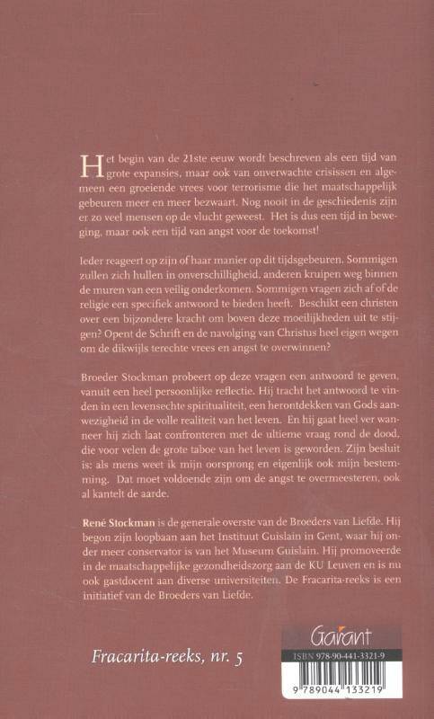 Broeder Stockman probeert op deze vragen een antwoord te geven, vanuit een heel persoonlijke reflectie. Hij tracht het antwoord te vinden in een levensechte spiritualiteit, een herontdekken van Gods aanwezigheid in de volle realiteit van het leven. En hij gaat heel ver wanneer hij zich laat confronteren met de ultieme vraag rond de dood, die voor velen de grote taboe van het leven is geworden. Zijn besluit is: als mens weet ik mijn oorsprong en eigenlijk ook mijn bestemming. Dat moet voldoende zijn om de angst te overmeesteren, ook al kantelt de aarde.