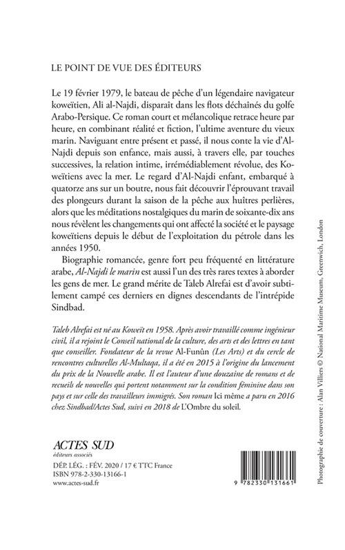 Le 19 février 1979, le bateau de pêche d'un légendaire navigateur koweïtien, Ali al-Najdi, disparaît dans les flots déchaînés du golfe Arabo-Persique. Ce roman court et mélancolique retrace heure par heure, en combinant réalité et fiction, l'ultime aventure du vieux marin. Naviguant entre présent et passé, il nous conte la vie d'Al-Najdi depuis son enfance, mais aussi, à travers elle, par touches successives, la relation intime, irrémédiablement révolue, des Ko-weïtiens avec la mer. Le regard d'Al-Najdi enfant, embarqué à quatorze ans sur un boutre, nous fait découvrir l'éprouvant travail des plongeurs durant la saison de la pêche aux huîtres perlières, alors que les méditations nostalgiques du marin de soixante-dix ans nous révèlent les changements qui ont affecté la société et le paysage koweïtiens depuis le début de l'exploitation du pétrole dans les années 1950.