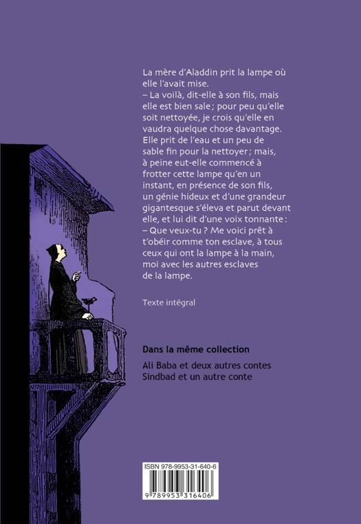 Histoire d'Aladdin ou la lampe mystérieuse. Elle prit de l'eau et un peu de sable fin, pour la nettoyer ; mais, à peine eut-elle commencé à frotter cette lampe, qu'en un instant, en présence de son fils, un génie hideux et d'une grandeur gigantesque s'éleva et parut devant elle, et lui dit d'une voix tonnante : Que veux-tu ? Me voici prêt à t'obéir, comme ton esclave et celui de tous ceux qui ont la lampe à la main, moi avec les autres esclaves de la lampe.