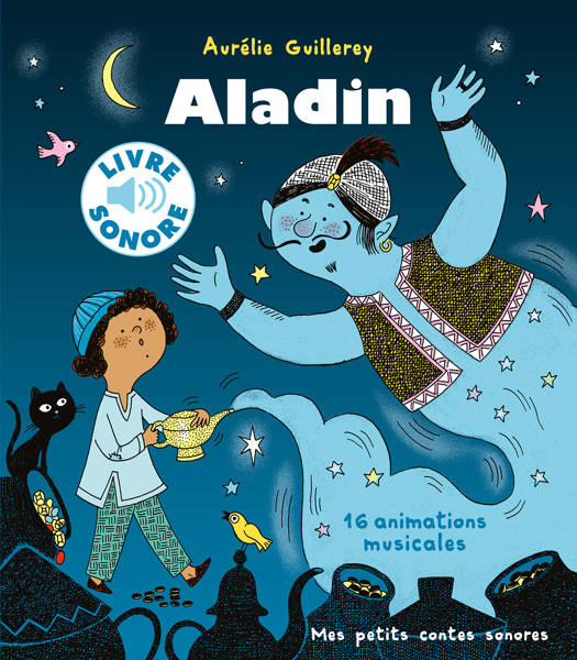Découvrez l'histoire d'Aladin et, à chaque page, amusez-vous à faire sonner les puces! Ecoutez Aladin chanter et faire et le pitre, le sorcier ricaner et le génie surgir de la lampe. Entendez les youyous de la foule, le tintement des pièces d'or, l'agonie du perroquet et la musique festive d'un mariage oriental. Une histoire toute en bruitages et en musique !