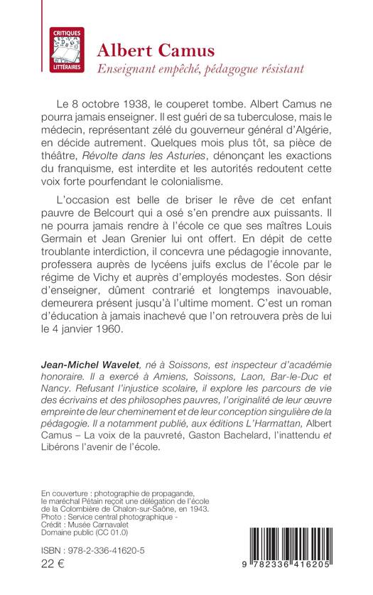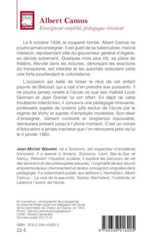 Le 8 octobre 1938, le couperet tombe. Albert Camus ne pourra jamais enseigner. Il est guéri de sa tuberculose, mais le médecin, représentant zélé du gouverneur général d’Algérie, en décide autrement. Quelques mois plus tôt, sa pièce de théâtre, Révolte dans les Asturies, dénonçant les exactions du franquisme, est interdite et les autorités redoutent cette voix forte pourfendant le colonialisme. L’occasion est belle de briser le rêve de cet enfant pauvre de Belcourt qui a osé s’en prendre aux puissants. Il ne pourra jamais rendre à l’école ce que ses maîtres Louis Germain et Jean Grenier lui ont offert. En dépit de cette troublante interdiction, il concevra une pédagogie innovante, professera auprès de lycéens juifs exclus de l’école par le régime de Vichy et auprès d’employés modestes. Son désir d’enseigner, dûment contrarié et longtemps inavouable, demeurera présent jusqu’à l’ultime moment. C’est un roman d’éducation à jamais inachevé que l’on retrouvera près de lui le 4 janvier 1960.