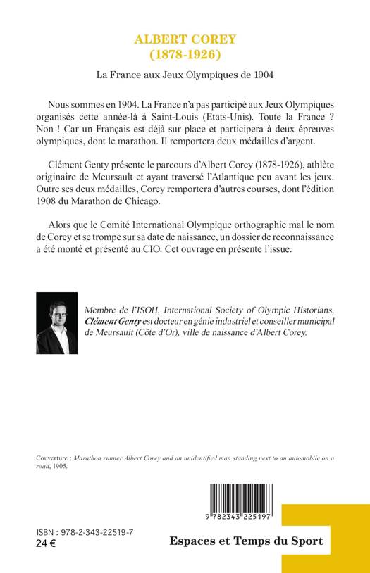 Nous sommes en 1904. La France n'a pas participé aux Jeux Olympiques organisés cette année-là à Saint-Louis (Etats-Unis). Toute la France ? Non ! Car un Français est déjà sur place et participera à deux épreuves olympiques, dont le marathon. Il remportera deux médailles d'argent. Clément Genty présente le parcours d'Albert Corey (1878-1926), athlète originaire de Meursault et ayant traversé l'Atlantique peu avant les jeux. Outre ses deux médailles, Corey remportera d'autres courses, dont l'édition 1908 du Marathon de Chicago. Alors que le Comité International Olympique orthographie mal le nom de Corey et se trompe sur sa date de naissance, un dossier de reconnaissance a été monté et présenté au CIO. Cet ouvrage en présente l'issue.