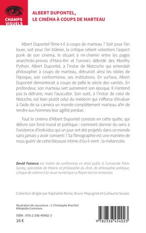 Albert Dupontel filme-t-il à coups de marteau ? Soit pour l'en louer, soit pour l'en blâmer, la critique retient volontiers l'aspect punk de son cinéma, le situant à mi-chemin entre les pages anarchisto-provos d'Hara-Kiri et l'univers débridé des Monthy Python. Albert Dupontel, à l'instar de Nietzsche qui entendait philosopher à coups de marteau, détruirait ainsi les idoles de l'époque, son conformisme, ses institutions. En surface, Albert Dupontel démonterait à coups de pelle le siècle des vanités. En profondeur, son marteau sert autrement son époque. Il n'entend pas la détruire, mais l'ausculter. Son outil, à l'instar de celui de Nietzche, est bien plutôt celui du médecin qui s'efforce d'évaluer à l'aide de sa caméra un monde complètement marteau afin de rendre aux hommes leur agilité perdue. Tout le cinéma d'Albert Dupontel consiste en cette quête, qui délivre son fond moral et politique comment donner du sens à l'existence d'individus qui un jour ont été projetés dans ce monde sans jamais y avoir consenti ? Sa filmographie est une manière de nous guérir de cette blessure intime d'où il vient la mélancolie.