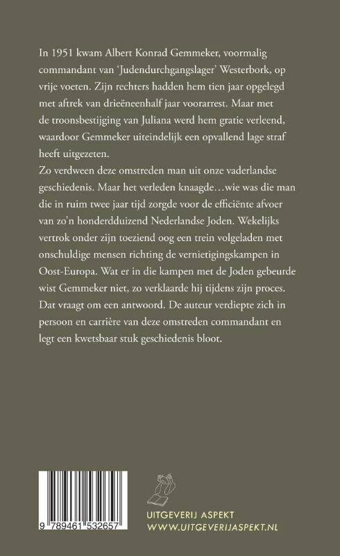 Maar het verleden knaagde... Wie was die man die in ruim twee jaar tijd zorgde voor de efficiënte afvoer van zo'n honderdduizend Nederlandse Joden? Wekelijks vertrok onder zijn toeziend oog een trein volgeladen met onschuldige mensen richting de vernietigingskampen in Oost-Europa. Wat er in die kampen met de Joden gebeurde wist Gemmeker niet, zo verklaarde hij tijdens zijn proces. Dat vraagt om een antwoord. De auteur verdiepte zich in de persoon en carrière van deze omstreden commandant en legt een kwetsbaar stuk geschiedenis bloot.