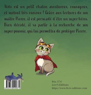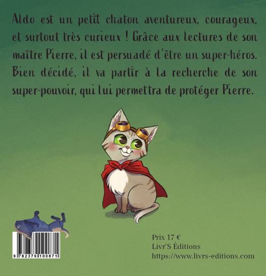 Aldo est un petit chaton aventureux, courageux, et surtout très curieux ! Grâce aux lectures de son maître Pierre, il est persuadé d’être un super-héros. Bien décidé, il va partir à la recherche de son super-pouvoir, qui lui permettra de protéger Pierre.