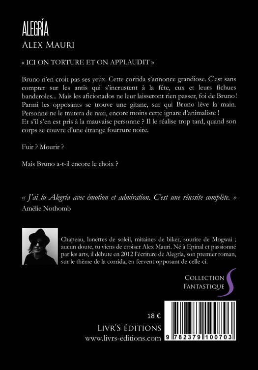 "ICI ON TORTURE ET ON APPLAUDIT ! Bruno n’en croyait pas ses yeux. Cette corrida s’annonçait grandiose. C’était sans compter sur les antis qui s’incrustent à la fête, eux et leurs fichues banderoles… Mais les aficionados ne laisseront rien passer, foi de Bruno ! Parmi les opposants se trouvait une gitane, sur qui Bruno leva la main. Personne ne le traiterait de nazi, encore moins cette ignare d’animaliste ! Et s’il s’en était pris à la mauvaise personne ? Il le réalisa trop tard, quand son corps se couvrit d’une étrange fourrure noire. Fuir ? Mourir ? Mais Bruno a-t-il encore le choix ?"