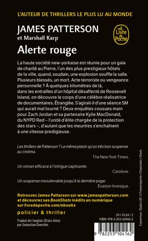 La haute société new-yorkaise est réunie au Pierre, l’un des plus prestigieux hôtels de la ville, pour un gala de charité. Soudain, une explosion souffle la salle. Plusieurs blessés, un mort. Acte terroriste ou vengeance personnelle ? À quelques kilomètres de là, dans les entrailles d’un hôpital désaffecté de Roosevelt Island, est retrouvé le corps d’une célèbre réalisatrice de documentaires. Étranglée. S’agirait-il d’une séance SM qui aurait mal tourné ? Deux enquêtes cousues main pour Zach Jordan et sa partenaire Kylie MacDonald, du NYPD Red, l’unité d’élite chargée de la protection des célébrités. D’autant que les meurtres s’enchaînent à une vitesse prodigieuse.