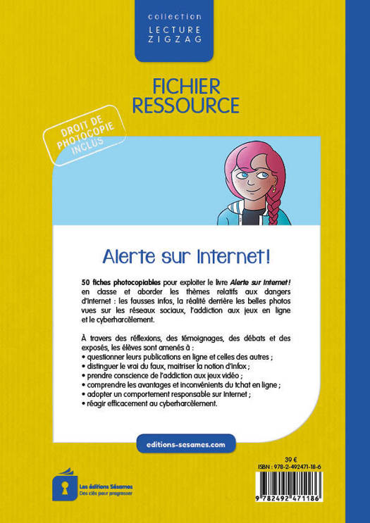 50 fiches photocopiables pour exploiter le livre Alerte sur Internet ! en classe et aborder les thèmes relatifs aux dangers d'Internet : les fausses infos, la réalité derrière les belles photos vues sur les réseaux sociaux, l'addiction aux jeux en ligne et le cyberharcèlement.
