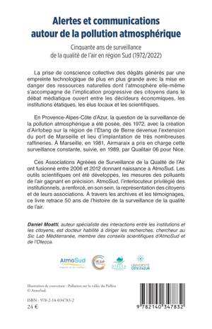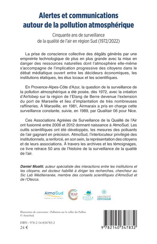La prise de conscience collective des dégâts générés par une empreinte technologique de plus en plus grande avec la mise en danger des ressources naturelles dont l'atmosphère elle-même s'accompagne de l'implication progressive des citoyens dans le débat médiatique ouvert entre les décideurs économiques, les institutions étatiques, les élus locaux et les scientifiques. En Provence-Alpes-Côte d'Azur, la question de la surveillance de la pollution atmosphérique a été posée, dès 1972, avec la création d'Airfobep sur la région de l'Etang de Berre devenue l'extension du port de Marseille et lieu d'implantation de très nombreuses raffineries. À Marseille, en 1981, Airmaraix a pris en charge cette surveillance constante, suivie, en 1989, par Qualitair 06 pour Nice. Ces Associations Agréées de Surveillance de la Qualité de l'Air ont fusionné entre 2006 et 2012 donnant naissance à AtmoSud. Les outils scientifiques ont été développés, les mesures des polluants de l'air gagnant en précision. AtmoSud, l'interlocuteur privilégié des institutionnels, a renforcé, en son sein, la représentation des citoyens et de leurs associations. À travers les archives et les témoignages, ce livre retrace 50 ans de l'histoire de la surveillance de la qualité de l'air.
