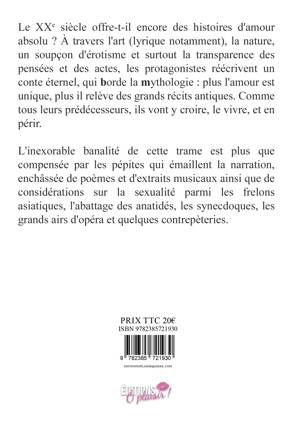 Le XXIe siècle offre-t-il encore des histoires d'amour absolu ? À travers l'art (lyrique notamment), la nature, l'érotisme et surtout la transparence des pensées et des actes, les protagonistes réécrivent un conte éternel, qui borde la mythologie: plus l'amour est unique, plus il relève des grands récits antiques. Comme tous leurs prédécesseurs, ils vont y croire, le vivre, et en périr.