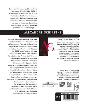 Réunis pour la première fois, ces textes révèlent les étapes de sa réflexion sur l’oeuvre de Scriabine depuis les premières rencontres entre les deux hommes à Moscou en 1902 jusqu’aux écrits des années 1950-1960. Dès 1909 et la création du Poème de l’Extase, Schloezer pressent la musique de Scriabine comme « le début d’une nouvelle époque de la culture ». Il précise cette intuition en analysant les tendances à la « dématérialisation » du son dans les sonates ou l’invention, dans les symphonies, de « l’accord de Prométhée » afin de mettre en évidence les nouvelles conceptions harmoniques de Scriabine. Cet ensemble de textes est révélateur de l’évolution de la philosophie de l’art de Schloezer qui s’élabore en dialogue continu avec le compositeur.