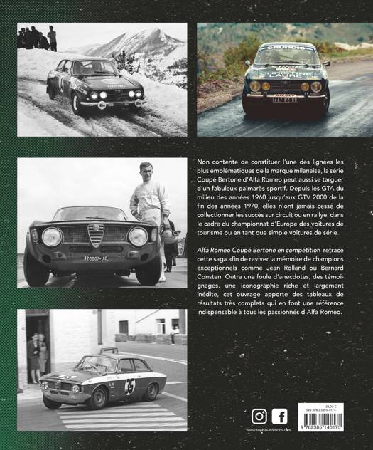 Non contente de constituer l’une des lignées les plus emblématiques de la marque milanaise, la série Coupé Bertone d’Alfa Romeo peut aussi se targuer d’un fabuleux palmarès sportif. Depuis les GTA du milieu des années 1960 jusqu’aux GTV 2000 de la fin des années 1970, elles n’ont jamais cessé de collectionner les succès sur circuit ou en rallye, dans le cadre du championnat d’Europe des voitures de tourisme ou en tant que simple voitures de série. Alfa Romeo Coupé Bertone en compétition retrace cette saga afin de raviver la mémoire de champions exceptionnels comme Jean Rolland ou Bernard Consten. Outre une foule d’anecdotes, des témoignages, une iconographie riche et largement inédite, cet ouvrage apporte des tableaux de résultats très complets qui en font une référence indispensable à tous les passionnés d’Alfa Romeo.