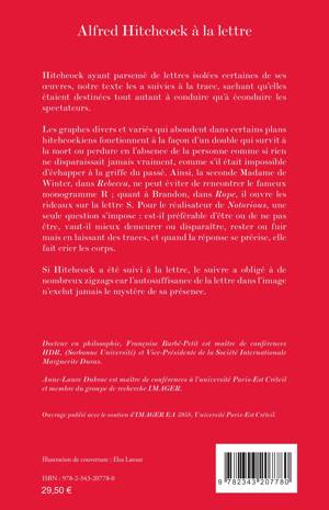 Hitchcock ayant parsemé de lettres isolées certaines de ses oeuvres, notre texte les a suivies à la trace. Les graphes divers et variés qui abondent dans certains plans hitchcockiens fonctionnent à la façon d’un double qui survit à la mort ou perdure en l’absence de la personne comme si rien ne disparaissait jamais vraiment, comme s’il était impossible d’échapper à la griffe du passé. Si Hitchcock a été suivi à la lettre, le suivre a obligé à de nombreux zigzags car l’autosuffisance de la lettre dans l’image n’exclut jamais le mystère de sa présence.