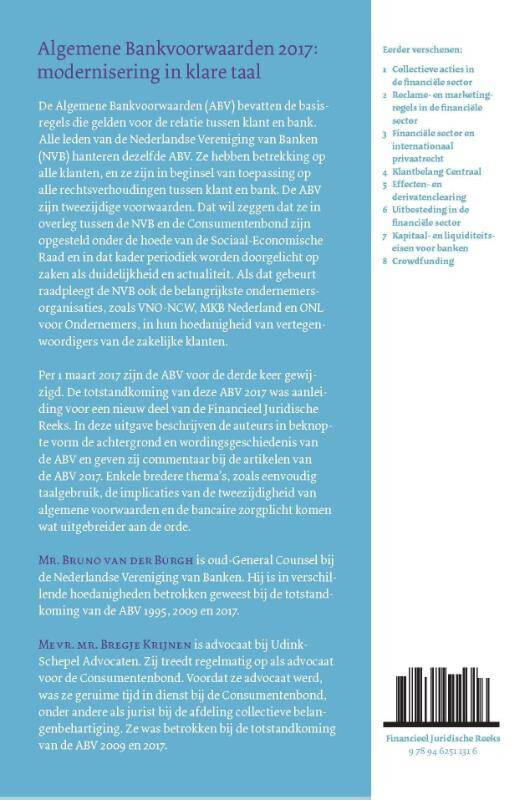 Per 1 maart 2017 zijn de ABV voor de derde keer gewijzigd. De totstandkoming van deze ABV 2017 was aanleiding voor een nieuw deel van de Financieel Juridische Reeks. In deze uitgave beschrijven de auteurs in beknopte vorm de achtergrond en wordingsgeschiedenis van de ABV en geven zij commentaar bij de artikelen van de ABV 2017. Enkele bredere thema's, zoals eenvoudig taalgebruik, de implicaties van de tweezijdigheid van algemene voorwaarden en de bancaire zorgplicht komen wat uitgebreider aan de orde.
