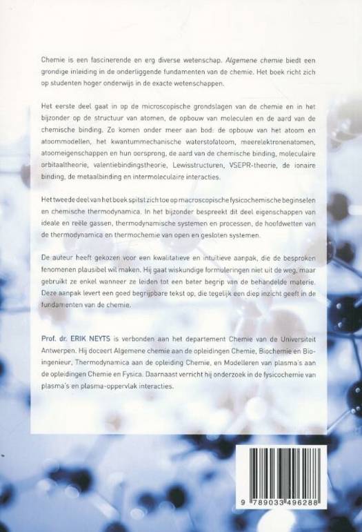 Algemene chemie biedt een grondige inleiding in de onder- liggende fundamenten van de chemie. Het eerste deel gaat in op de microscopische grondslagen van de chemie en in het bijzonder op de structuur van atomen, de opbouw van moleculen en de aard van de chemische binding. Het tweede deel van het boek spitst zich toe op macroscopische fysicochemische beginselen en chemische thermodynamica. In het bijzonder bespreekt dit deel eigenschappen van ideale en reële gassen, thermo- dynamische systemen en processen, de hoofdwetten van de thermodynamica en thermochemie van open en gesloten systemen. De auteur heeft gekozen voor een kwalitatieve en intuïtieve aanpak, die de besproken fenomenen plausibel wil maken.