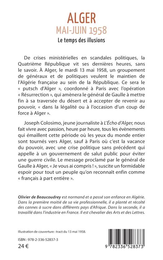 De crises ministérielles en scandales politiques, la Quatrième République vit ses dernières heures, sans le savoir. À Alger, le mardi 13 mai 1958, un groupement de généraux et de politiques veulent le maintien de l'Algérie française au sein de la République. Ce sera le putsch d'Alger, coordonné à Paris avec l'opération Résurrection, qui amènera le général de Gaulle à mettre fin à sa traversée du désert et à accepter de revenir au pouvoir, dans la légalité ou à l'occasion d'un coup de force à Alger . Joseph Colosimo, jeune journaliste à L'Écho d'Alger, nous fait vivre avec passion, heure par heure, tous les évènements qui émaillent cette période où les yeux du monde entier sont tournés vers Alger, sauf à Paris où c'est la vacance du pouvoir, avec une crise politique sans précédent qui appelle à un gouvernement de salut public pour éviter une guerre civile. Le message proclamé par le général de Gaulle à Alger, Je vous ai compris !, suscite un formidable espoir pour tout un peuple qu'on reconnaît enfin comme français à part entière .