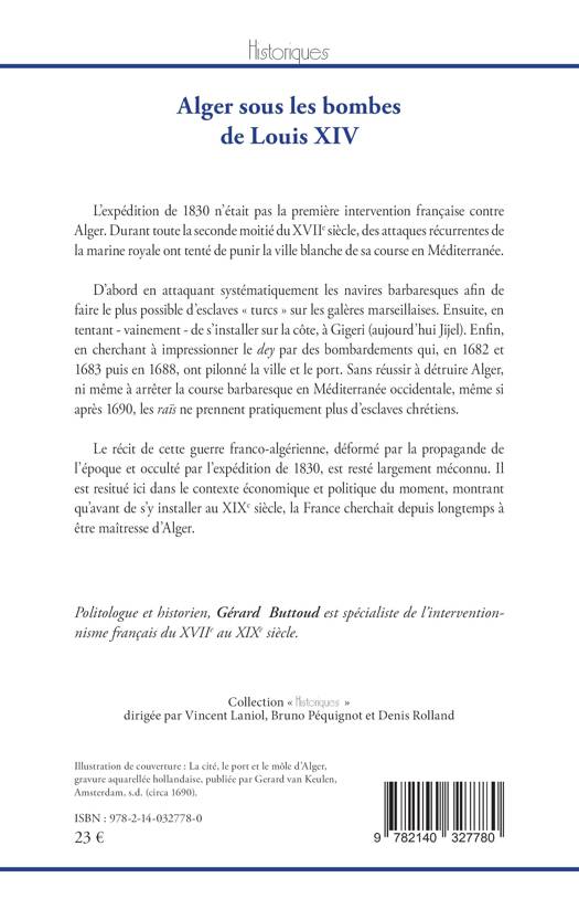 L'expédition de 1830 n'était pas la première intervention française contre Alger. Durant toute la seconde moitié du XVIIe siècle, des attaques récurrentes de la marine royale ont tenté de punir la ville blanche de sa course en Méditerranée. D'abord en attaquant systématiquement les navires barbaresques afin de faire le plus possible d'esclaves « turcs » sur les galères marseillaises. Ensuite, en tentant - vainement - de s'installer sur la côte, à Gigeri (aujourd'hui Jijel). Enfin, en cherchant à impressionner le dey par des bombardements qui, en 1682 et 1683 puis en 1688, ont pilonné la ville et le port. Sans réussir à détruire Alger, ni même à arrêter la course barbaresque en Méditerranée occidentale, même si après 1690, les raïs ne prennent pratiquement plus d'esclaves chrétiens. Le récit de cette guerre franco-algérienne, déformé par la propagande de l'époque et occulté par l'expédition de 1830, est resté largement méconnu. Il est resitué ici dans le contexte économique et politique du moment, montrant qu'avant de s'y installer au XIXe siècle, la France cherchait depuis longtemps à être maîtresse d'Alger.