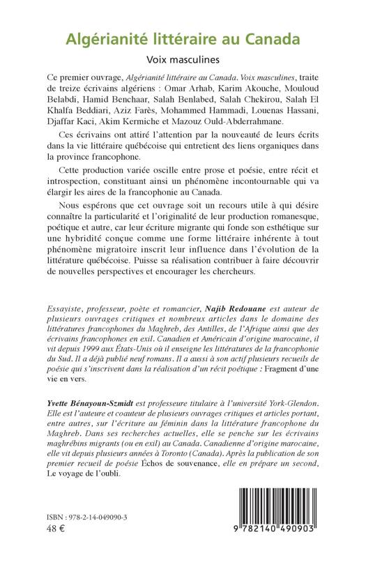 Ce premier ouvrage, Algérianité littéraire au Canada. Voix masculines, traite de treize écrivains algériens: Omar Arhab, Karim Akouche, Mouloud Belabdi, Hamid Benchaar, Salah Benlabed, Salah Chekirou, Salah El Khalfa Beddiari, Aziz Farès, Mohammed Hammadi, Louenas Hassani, Djaffar Kaci, Akim Kermiche et Mazouz Ould-Abderrahmane. Ces écrivains ont attiré l'attention par la nouveauté de leurs écrits dans la vie littéraire québécoise qui entretient des liens organiques dans la province francophone. Cette production variée oscille entre prose et poésie, entre récit et introspection, constituant ainsi un phénomène incontournable qui va élargir les aires de la francophonie au Canada. Nous espérons que cet ouvrage soit un recours utile à qui désire connaître la particularité et l'originalité de leur production romanesque, poétique et autre, car leur écriture migrante qui fonde son esthétique sur une hybridité conçue comme une forme littéraire inhérente à tout phénomène migratoire inscrit leur influence dans l'évolution de la littérature québécoise. Puisse sa réalisation contribuer à faire découvrir de nouvelles perspectives et encourager les chercheurs.
